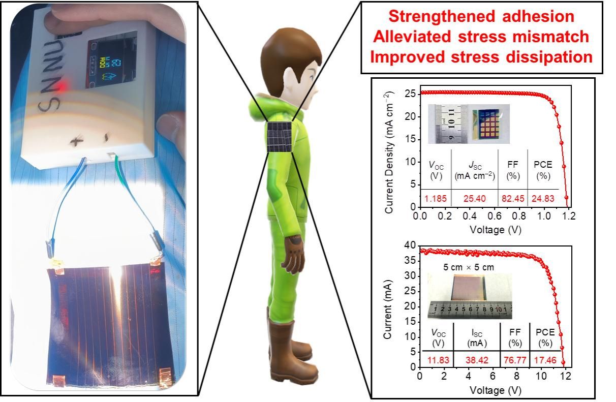 近日,公司赵奎教授团队提出在埋层界面处使用粘附性聚合物建立柔性电子机械应力释放通道的新方案,实现了高效高机械性能的柔性钙钛矿太阳电池及组件。团队发现:粘附性聚丙烯酰胺聚合物有效释放了柔性器件在机械应变下的应力积累,同时也加速了钙钛矿从埋底界面到本体的δ-α相变动力学,从而提高了柔性太阳电池的光伏性能和机械性能。基于此,分别在小面积(0.06 cm2)柔性电池上实现24.83%(认证24.41%)效率、大面积(20 cm2)柔性模组实现17.46%效率,模组的功质比达到1745 W/kg,并展示了自供电的可穿戴脉搏测量设备应用示范。团队也首次对器件在机械应变下工作时的电池揭示了性能衰减机制和增稳机制,实现7000次弯曲循环后效率95%以上。
