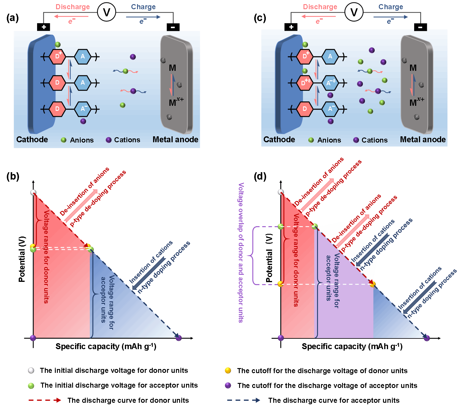 近日,公司铁电功能材料与器件创新团队张崇副研究员联合江汉大学蒋加兴教授以及俄勒冈州立大学纪秀磊教授在有机-铝双离子电池领域取得重要研究进展。团队通过利用电解液诱导的电子给体与受体之间的电化学电势区间重合,实现了给-受体型聚合物电化学反应过程中的原位掺杂,有效促进了其n/p-型掺杂反应中的离子和电子传输。制备的双极性给-受体型共轭聚合物作为铝双离子电池的正极材料能够实现205 mAh g−1的比容量,即使在15 A g−l下仍具有160 mAh g-1的比容量,循环6万次后的容量保持率为78.4%。该聚合物正极材料在100 mg cm−2的活性物质负载量下能够实现17 mAh cm−2的面积容量。