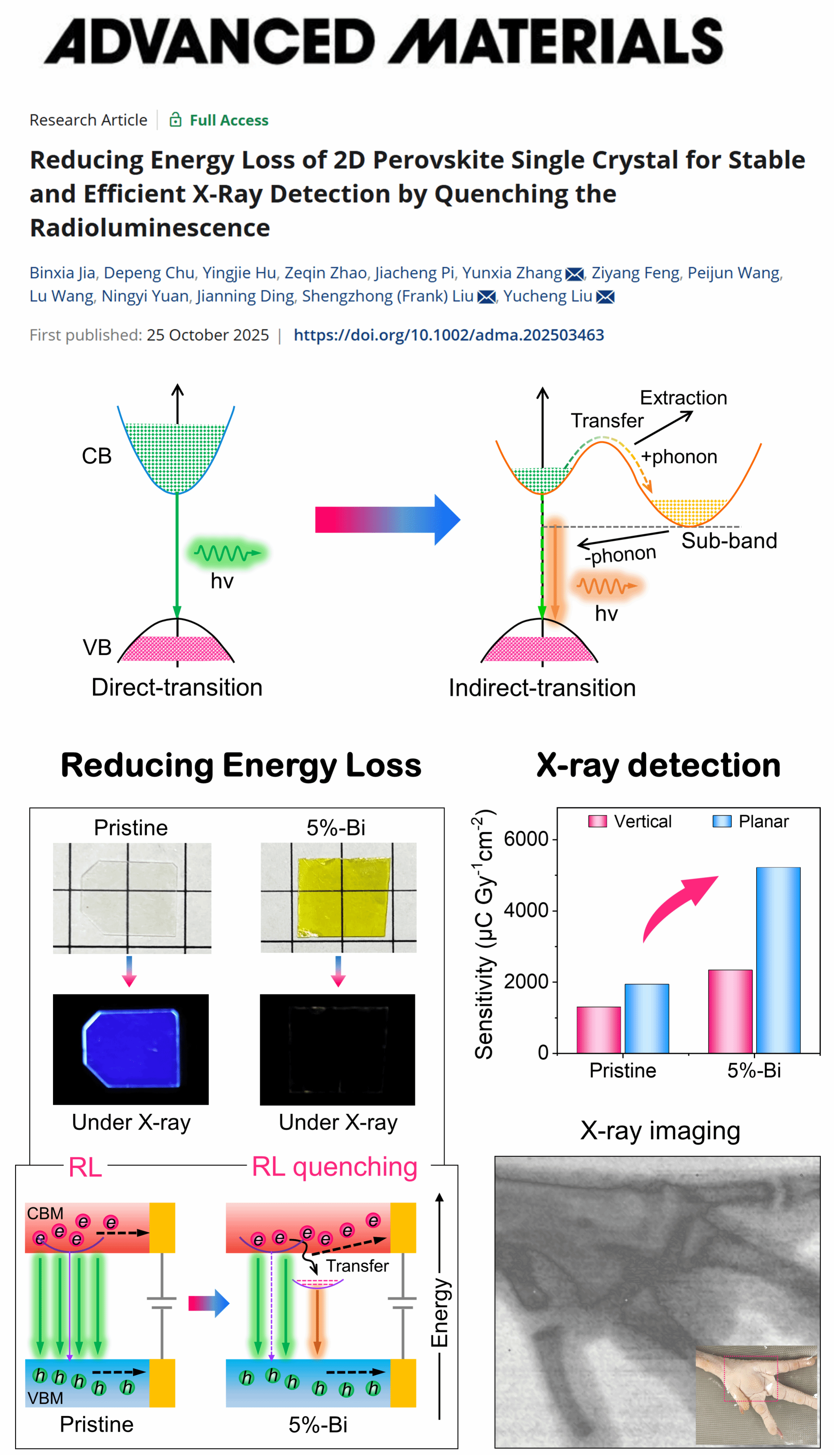 X射线探测成像技术在医学诊断、工业无损检测、安全检查等领域具有重要的应用。二维(2D)卤化物钙钛矿具有电阻率大、稳定性好、层间距可调、X射线吸收强等优点,是一种很有前途的X射线探测材料。然而,2D钙钛矿的高激子结合能使其在X射线辐照下会产生明显的辐射发光(RL),这在探测过程中造成不可忽略的能量损失,从而限制了探测灵敏度的进一步提升。因此,降低辐照发光并同时优化2D钙钛矿的层间间距以提升载流子传输效率,是实现高性能X射线探测的有效策略。