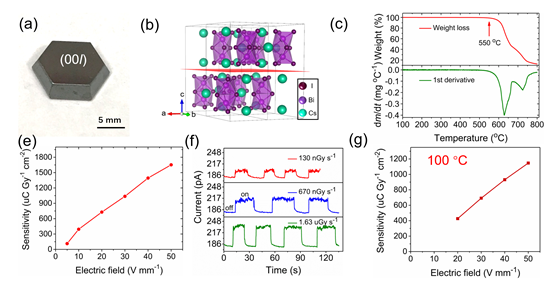 近日,公司刘生忠教授团队利用全无机Cs3Bi2I9单晶成功研制了在高温下稳定工作的钙钛矿单晶X射线探测器。全无机Cs3Bi2I9单晶的具有热稳定性好(550 °C不分解)、不含有高毒性铅、低离子迁移率和高体电阻率等特点,很好的解决了上述问题。但是Cs3Bi2I9的结构为缺陷型钙钛矿,它在低温溶液中一旦达到临界点,极易成核,另外在优势晶核的条件下,它也会继续大量成核,难以控制。因此,低温溶液法生长大尺寸高质量的Cs3Bi2I9晶体成了研究的难题。针对这一难点,刘生忠教授研究团队开发了一种成核控制的低温溶液法来培养大尺寸的Cs3Bi2I9钙钛矿单晶。利用该技术,成功获得厘米级大小的高质量单晶。更重要的是,由于Cs3Bi2I9单晶具有高的X射线吸收效率,低的缺陷态密度和离子迁移率,以及低的噪声电流等优势,因此使用Cs3Bi2I9单晶制备的探测器对X射线表现出较高的探测性能。在50 V mm-1的电场强度下,Cs3Bi2I9单晶X射线探测器的灵敏度达到1652.3 μC Gyair-1 cm-2,检测限为130 nGyair s-1。由于该器件具有超稳定的基线和输出信号,从而展现出优异的成像能力。此外,Cs3Bi2I9单晶优异的热稳定性保证了该单晶X射线探测器在100 °C高温下也可以稳定的工作。