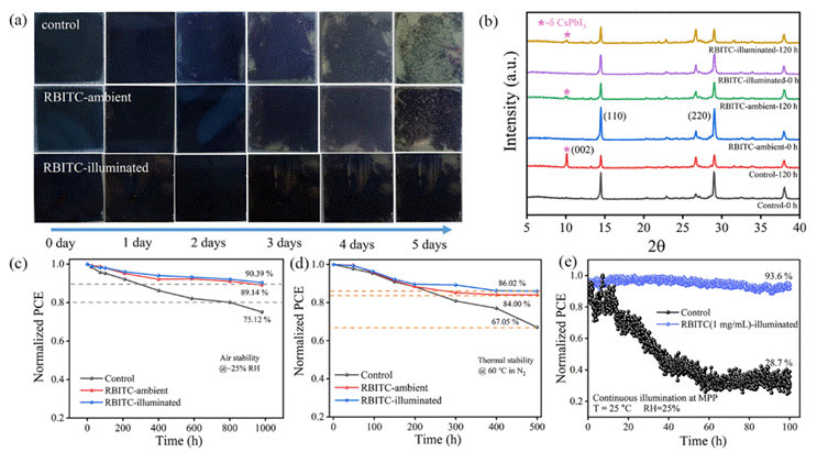 团队开发了一种光诱导调控钙钛矿结晶质量和钝化效果的新方法。采用染料---异硫氰酸罗丹明B(RBITC)作为光牺牲剂,使其在CsPbI3纳米粒子的光热催化下完全分解并原位释放出乙基铵阳离子、异硫氰酸根阴离子和苯甲酸分子,这些分子和离子可以调控钙钛矿薄膜的生长过程及钝化钙钛矿中的缺陷。乙基铵阳离子可以有效地钝化钙钛矿晶粒的表面缺陷。异硫氰酸根阴离子与未配位的Pb结合以调节结晶过程。苯甲酸分子促进了钙钛矿晶体的成核。研究结果证明提高光照可以有效加速这些有益离子/分子的释放,从而进一步提高钙钛矿薄膜的结晶质量和缺陷钝化效果。在使用RBITC进行优化后,器件获得1.24 V的高开路电压(VOC)和20.95%的冠军PCE。在25%湿度条件下储存1000小时后,未封装PSC器件的PCE保持初始效率的90.39%;在60 ℃的N2气氛中储存500小时后,PCE保持原始效率的86.02%;在连续光照条件下最大功率点跟踪100小时,PCE仍然能保持初始效率的93.6%。该工作近日发表于国际知名期刊Advanced Functional Materials上。