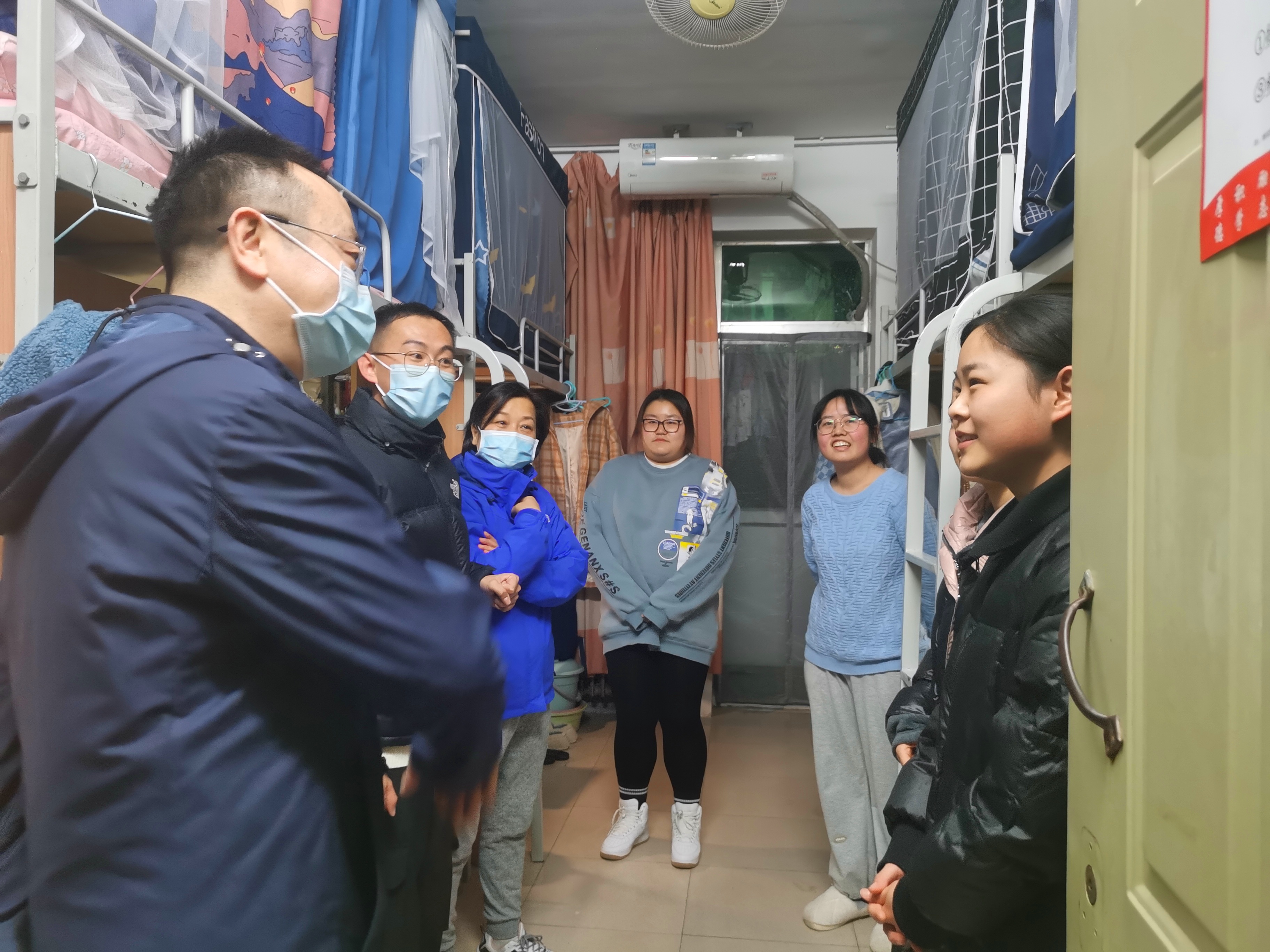 靳春泓和陈煜一一走访每个宿舍,与同学们亲切交流,了解大家的近况,还细致询问了同学们公司管控之后的生活适应情况和复习进度等,就同学们普遍关注的问题进行解答。