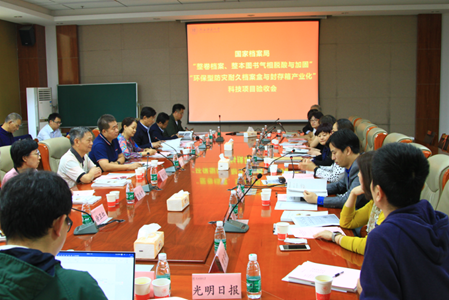 本次会议邀请了原南京博物院经理奚三彩、中国人民大学教授张美芳、秦始皇帝陵博物院研究馆员周铁、国防大学教授彭远明、沈阳档案馆处长徐卫红、四川档案局副局长罗亚夫、西安市档案馆副馆长黄海绒为评审专家。李玉虎教授向领导与专家们展示并汇报了关于公司“档案无公害整体脱酸加固与杀虫灭菌同步关键技术”以及“环保型防灾耐久档案盒与封存箱产业化”两项档案科技项目的研究成果。