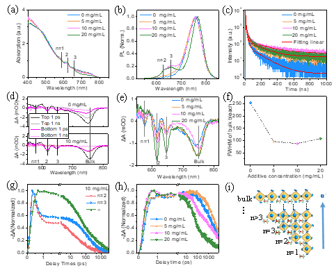 近日,公司赵奎教授和刘生忠教授带领的团队在二维钙钛矿组分优化及高效稳定二维钙钛矿太阳能电池制备方面取得重要进展。研究人员采用添加剂策略,通过组分优化(GA)(MA)nPbnI3n+1(<n> =3),并对ACI型的量子阱厚度分布和电荷传输机制进行了详细的阐述。形貌表征证实了添加剂有效增加了钙钛矿晶粒尺寸和薄膜表面平整度;通过瞬态吸收光谱证实了添加剂有效促进量子阱(QW)的厚度呈现出梯度分布,从而通过在低n相和高n相 QW之间进行有效的电荷转移和传输,极大的提高了载流子传输效率,并进一步抑制了非辐射电荷复合。最终,由于开路电压(Voc)和填充因子(FF)的显着提高,经过添加剂处理的ACI钙钛矿太阳电池的光电转化效率达到了18.48%。相关研究成果以题为“Compositional Control in Two-Dimensional Perovskites withAlternating Cations in theInterlayer Space for Photovoltaicswith Efficiency over18%”发表在《先进材料》上(Advanced Materials,DOI:10.1002/adma.201903848,https://onlinelibrary.wiley.com/doi/full/10.1002/adma.201903848)。刘生忠教授和赵奎教授为共同通讯作者,2017级硕士研究生罗涛和张亚兰为论文的并列第一作者。这是目前二维钙钛矿太阳电池的世界最高效率。该研究成果为二维钙钛矿的组分优化建立了基本指导,将有助于进一步提高钙钛矿太阳能电池性能,进一步走向工业化。