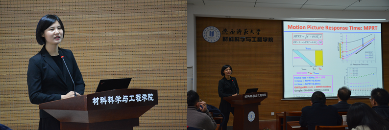 随后,吴教授的员工黄玉格博士进行了题为“用于AR/VR的高动态范围显示和快速响应液晶材料”的学术报告。她与大家分享了增强现实(AR)和虚拟现实(VR)显示器件所需的两个重要特性:高动态范围(HDR)和快速响应时间,评价了传统液晶显示(LCD)和有机发光二极管(OLED)显示在实现HDR性能中的优劣势,并着重介绍了Mini-LED阵列式背光的局部调光液晶显示器在HDR显示技术上的优势。黄玉格博士的学术报告内容丰富,紧扣液晶发展前沿,为相关专业师生提供了很好的科研新思路,扩宽了视野,增长了见识。