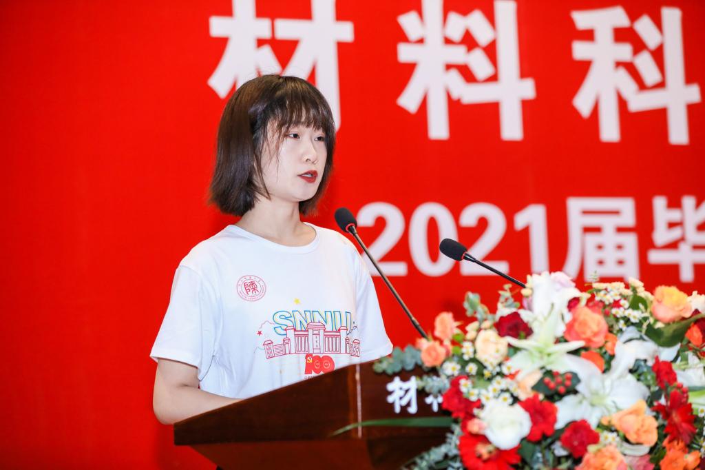 教师代表胡道道教授在发言中对同学们及其家长表示祝贺。其次,他以员工身份分享了自己的生活感悟,并以“三原理一法则五定律(简称315)”与毕业生共勉。最后,他希望同学们在以后的道路上用道德完美自己,用知识充实自己,用理想坚信自己,用成功肯定自己,为国家和社会做出更大的成就。2021届毕业生代表博士生张云霞、本科生田聿潇分别发言,她们深情地回忆了精彩充实的校园生活,以及每一阶段大家的付出与努力,生于这个时代,幸福感满满、仪式感满满,感恩这个时代。她们对老师们多年的教诲满怀感激,对同学的同窗之谊满心怀念。祝愿全体毕业生前程似锦,砥砺前行,能够为母院母校增辉添彩。