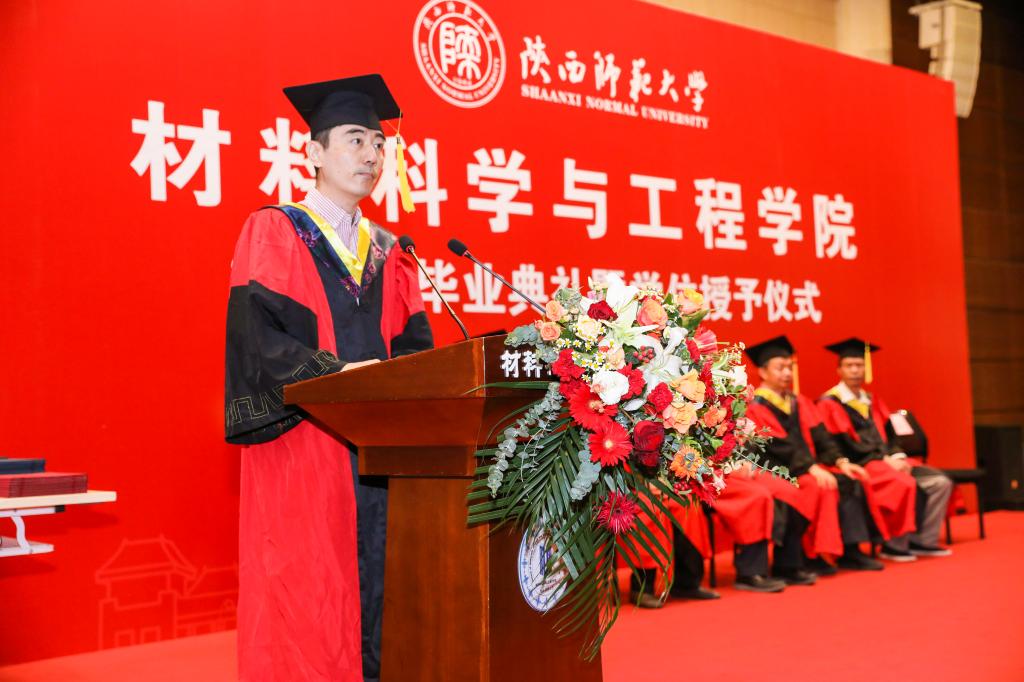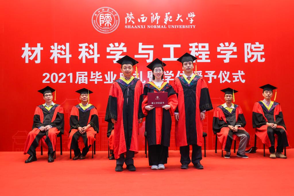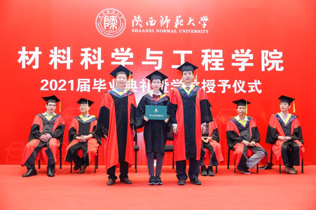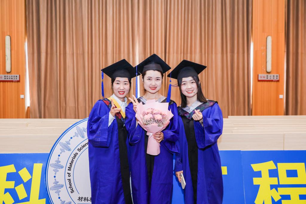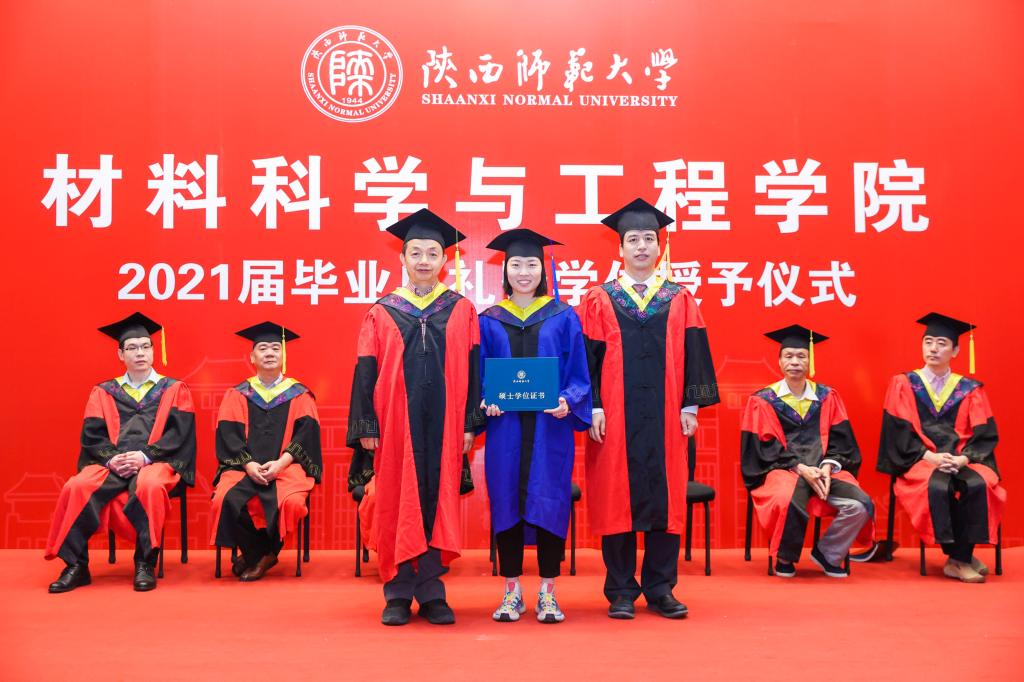 第二个环节是学位授予仪式。在校歌环绕的会场,进行了庄严又隆重的学位授予仪式,材料学分会主席陈新兵教授、分会委员刘生忠教授、分会委员刘宗怀教授为每一位毕业生颁授学位并合影留念。