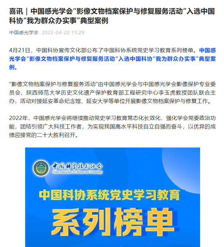4月21日,中国科协宣传文化部公布了中国科协系统党史学习教育系列榜单。由中国感光学会联合公司伟德bv国际体育历史文化遗产保护教育部工程研究中心李玉虎教授团队主办的“影像文物档案保护与修复服务活动”,入选中国科协“我为群众办实事”典型案例。