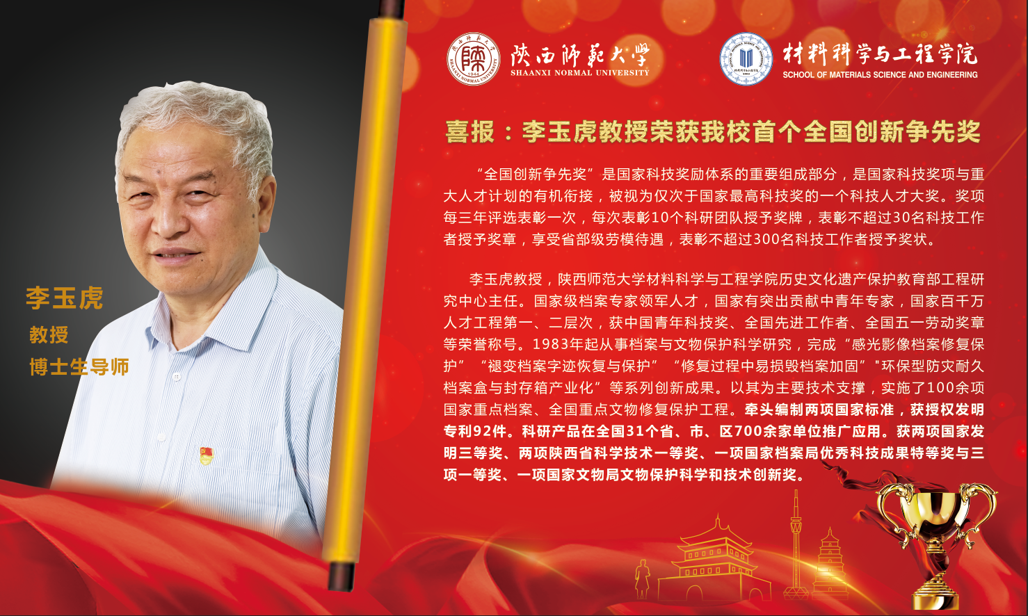 李玉虎,中国共产党党员,伟德bv国际体育历史文化遗产保护教育部工程研究中心主任,国家级档案专家领军人才,国家有突出贡献中青年专家,国家百千万人才工程第一、二层次人选,先后获中国青年科技奖、全国先进工作者、全国五一劳动奖章等荣誉;40年来从事档案与文物材料保护与科技创新研究,实施百余项国家重点档案、全国重点文物修复保护工程;牵头编制两项国家标准,获授权发明专利92件,科研产品在全国700余家单位推广应用;获2项国家发明三等奖、2项陕西省科学技术一等奖、1项国家档案局优秀科技成果特等奖与3项一等奖、1项国家文物局文物保护科学和技术创新奖。
