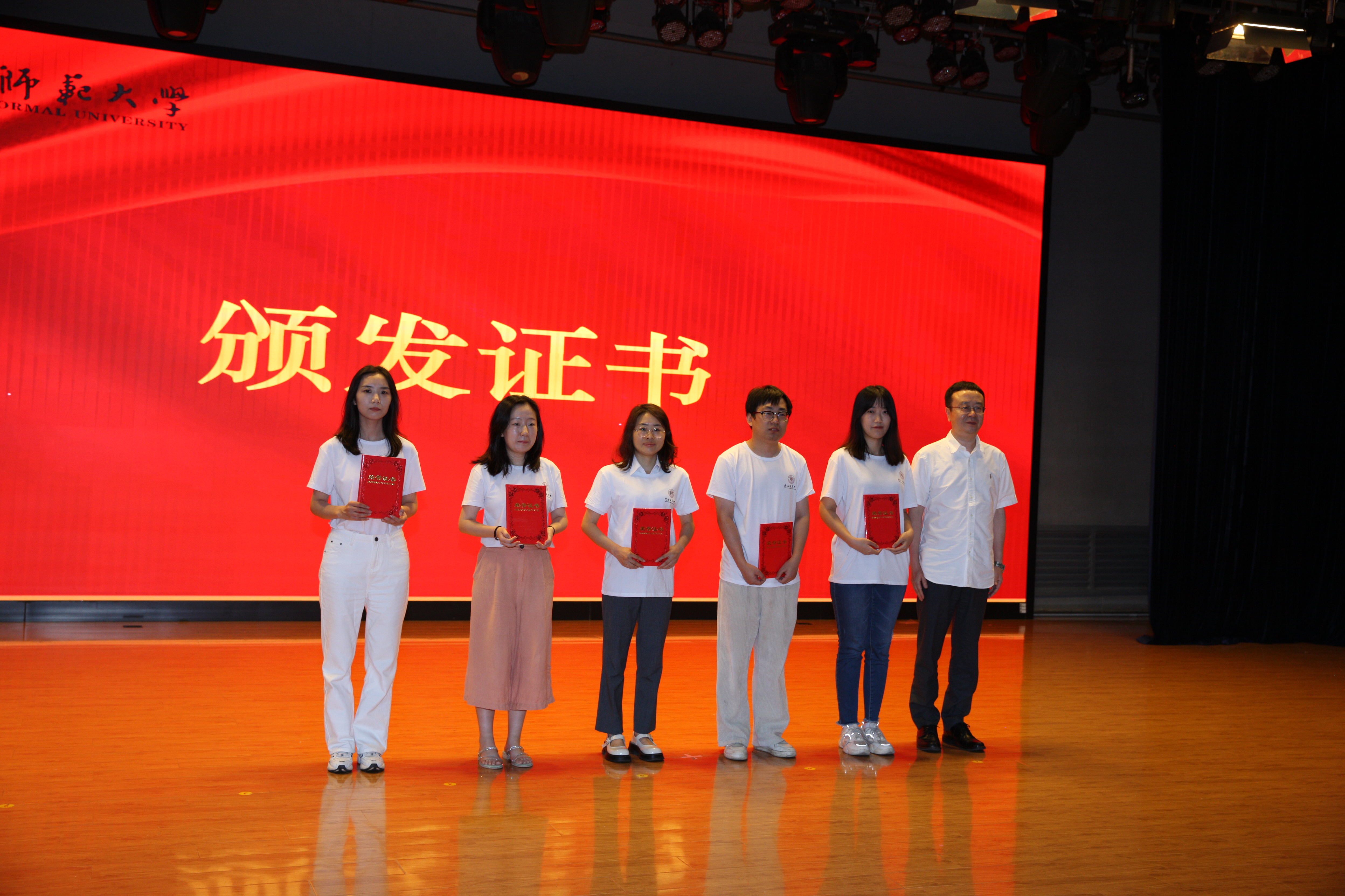 王强宣读《关于表彰优秀学位论文(毕业设计)作者的决定》,江瑞斌宣读《关于表彰研究生优秀学位论文作者的决定》,陈沛、陈煜、徐华三位教授为优秀学位论文获得者颁发证书。